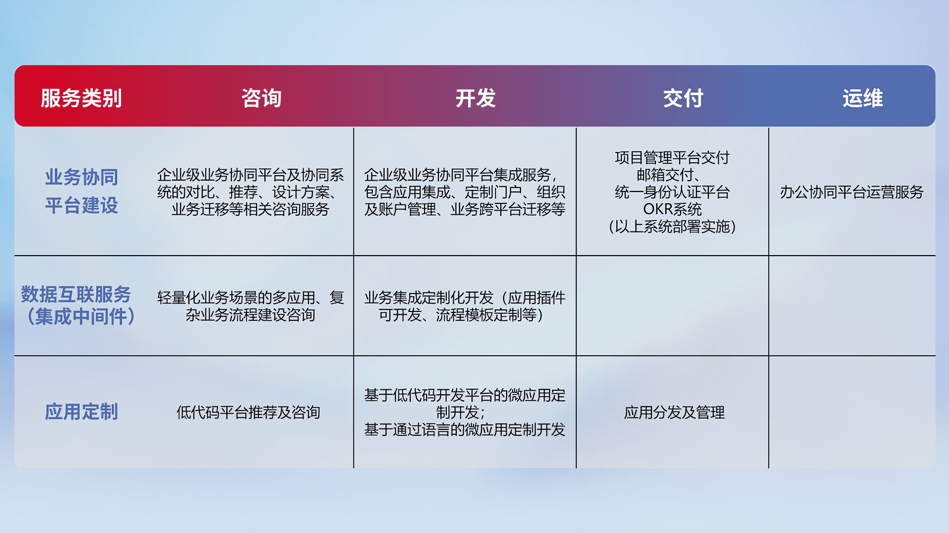 针对钉钉、、、、企微、、、IDaas等平台级产品提供产品的规划、、方案、、交付、、定制化开发等服务,,,实现如统一协同办公、、智能客户服务、、、、混合会议管理、、智能数据查询、、、、等业务场景,,,,实现数字化转型。。。。